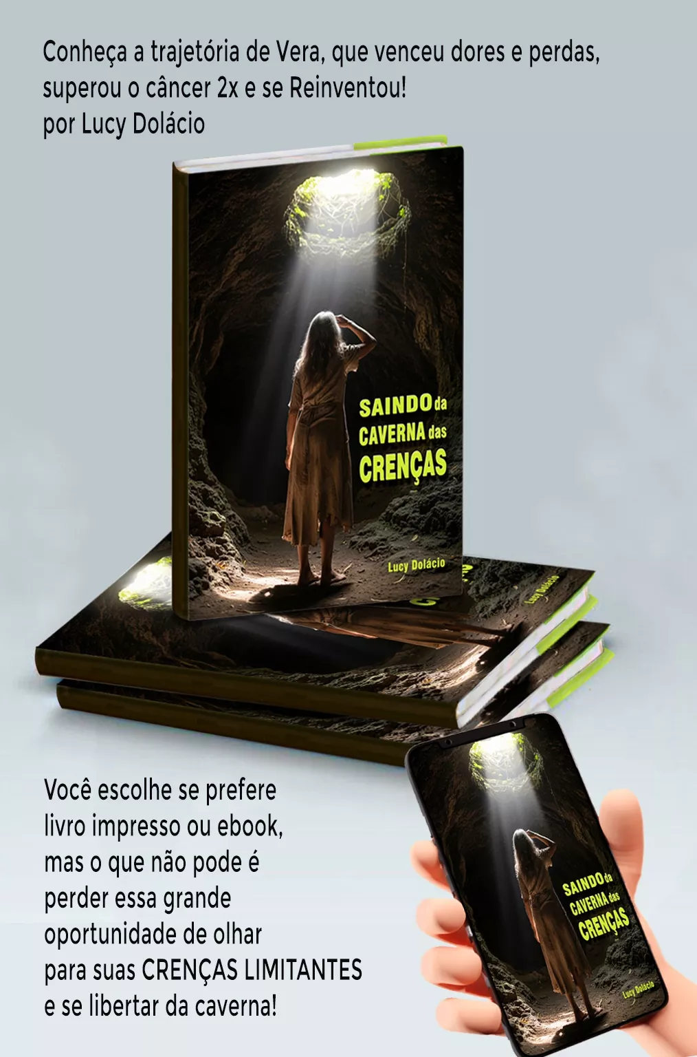 Em Saindo da Caverna das Crenças, Lucy Dolácio, psicanalista e terapeuta integrativa, guia você por um caminho de autoconhecimento e empoderamento. Com reflexões profundas e exercícios práticos, descubra como identificar e superar as crenças limitantes que te impedem de avançar. Prepare-se para abraçar a vulnerabilidade como força, descobrir a alegria de ser infinitamente resiliente e florescer em sua versão mais autêntica e livre.